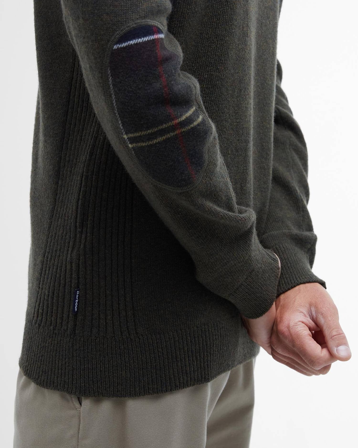 Sa conception soignée inclut des emmanchures fully-fashioned, un col montant côtelé chaud et confortable, zippé avec une fermeture griffée Barbour, ainsi que des panneaux latéraux côtelés et des patchs de coudes contrastés qui ajoutent une touche subtile et élégante.