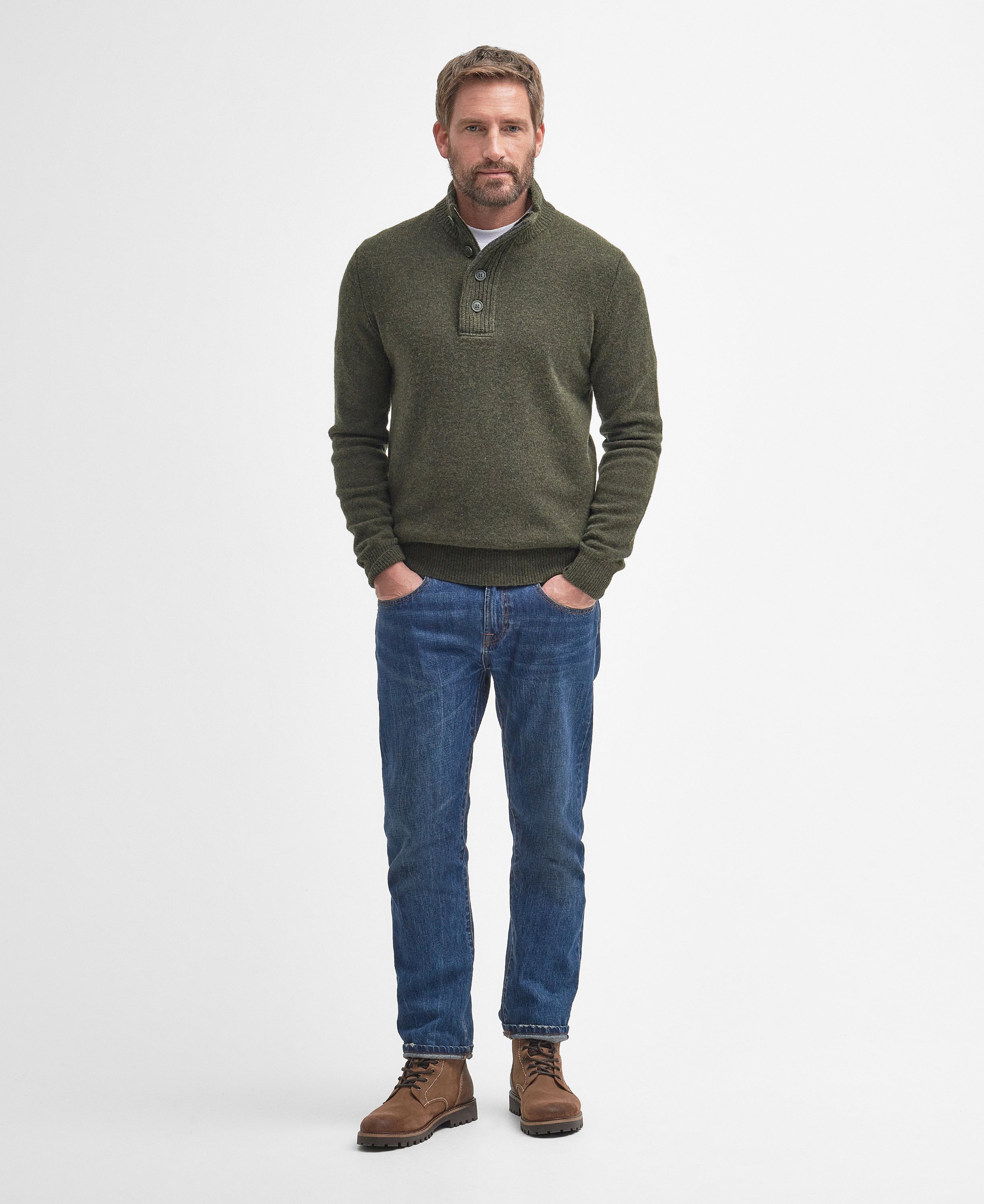 Confectionné en laine 100 %, ce sweat Barbour se distingue par ses empiècements en cuir aux coudes, clin d’œil raffiné à l’héritage country de la marque. Doté d’un col montant boutonné et de manches longues, il offre une chaleur optimale et un confort enveloppant. Une pièce à la fois fonctionnelle et intemporelle, idéale pour rester bien au chaud avec style.