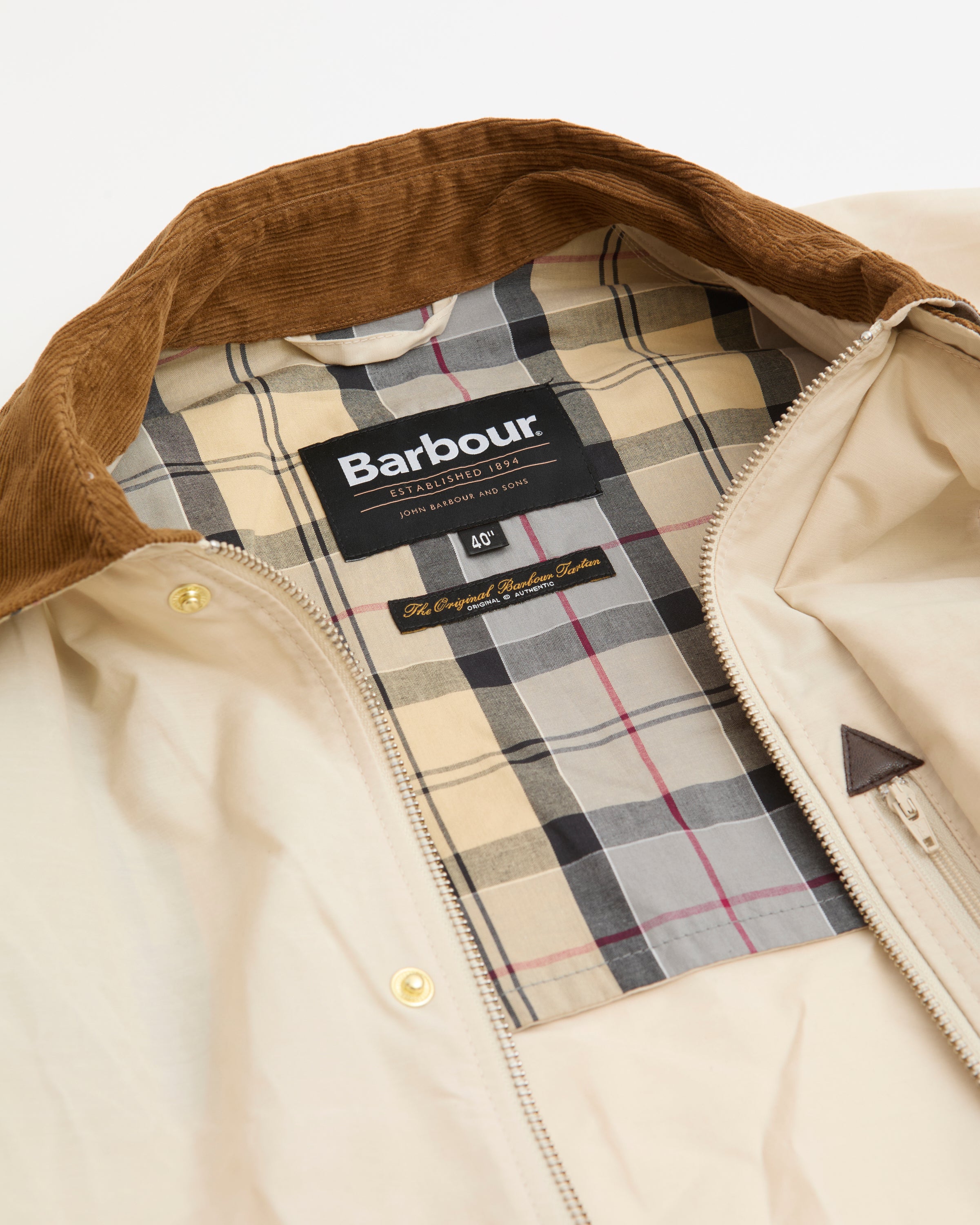 Son col en velours côtelé signature, agrémenté d’un liseré en coton tartan, rend hommage à l’ADN heritage de la marque. La broderie Barbour et le badge épingle au col viennent parfaire l’ensemble avec une touche distinctive.