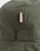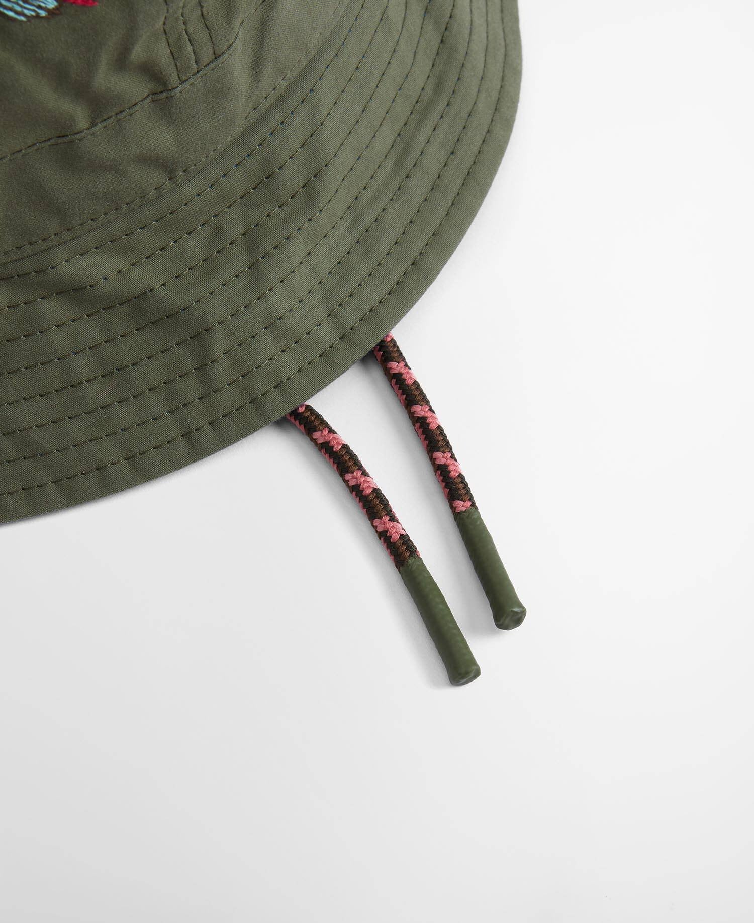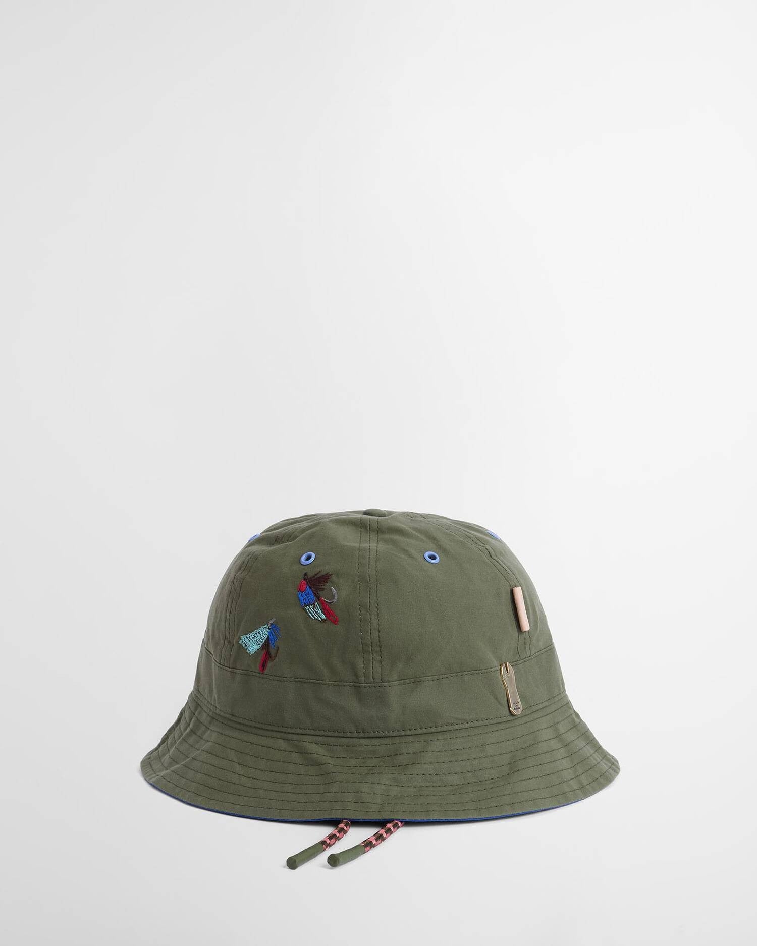 Les œillets contrastés et la sous-visière contrastante apportent du relief au design. À l’avant, des motifs de mouches de pêche brodés à la main insufflent une note ludique et décalée, clin d’œil à l’univers de la pêche et à l’héritage champêtre de Barbour, revisité à travers l’œil créatif de Paul Smith.